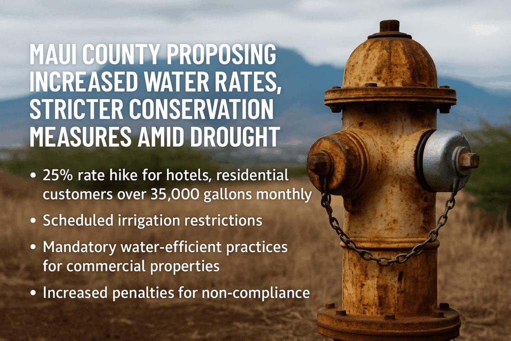 Maui County is proposing increased water rates and stricter conservation measures in response to ongoing drought conditions affecting West, Central, and South Maui. The Department of Water Supply suggests a 25% rate hike for hotels and residential customers consuming over 35,000 gallons monthly, aiming to encourage reduced water usage. Additional measures include scheduled irrigation restrictions, mandatory water-efficient practices for commercial properties, and increased penalties for non-compliance. These initiatives are part of a broader effort to manage limited water resources and promote sustainable consumption across the county. ​Maui Now+2Maui Now+2Maui Now+2